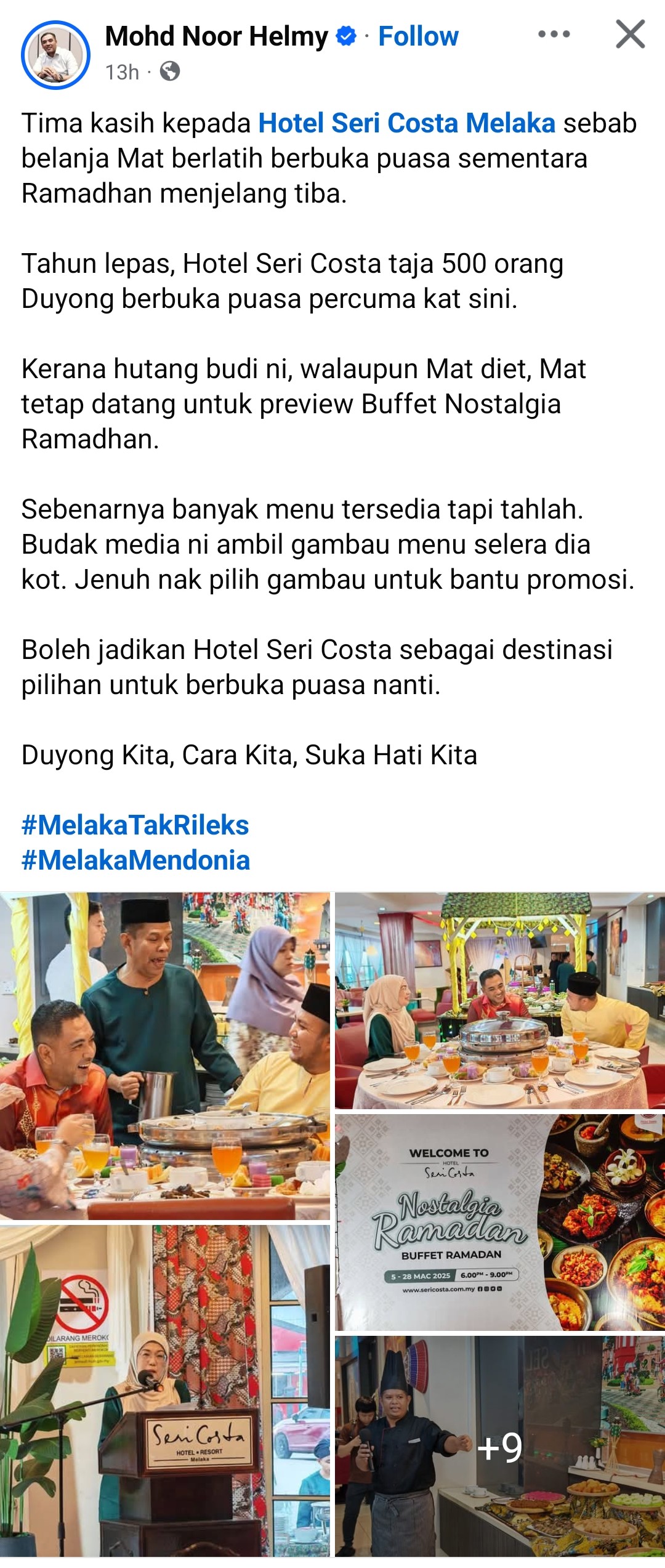 ADUN Duyong, YB Datuk Mohd Noor Helmy bin Abdul Halem menyokong penuh inisiatif program infaq Ramadan Hotel Seri Costa, Melaka. Beliau membantu menyediakan penama asnaf yang layak di kawasan Duyong serta perkhidmatan bas percuma untuk mereka.